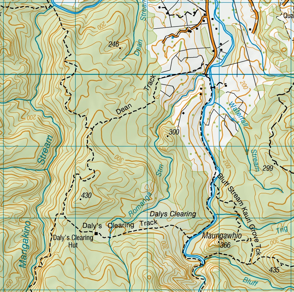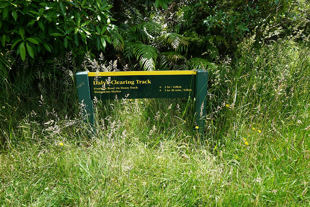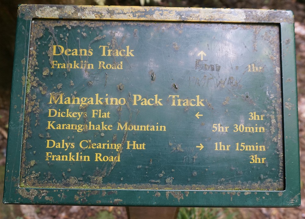 A loop walk in the Kaimai Forest Park, starting and ending on Franklin Rd near Karangahake, uses the Dean Track, part of the Mangakino Pack Track, Daly’s Clearing Track, and part of the Waitawheta Tramway Track. At the Franklin Rd end the walk passes through privately-owned farmland. There is a small parking area on Franklin Rd, but no toilet or other facilities.