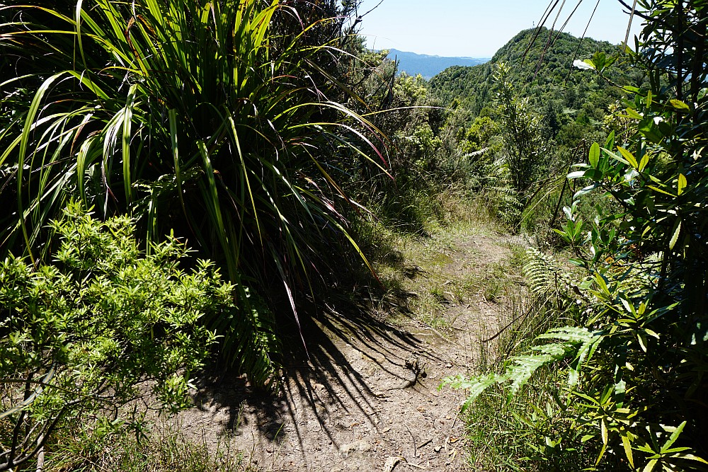 The track to the trig station is unmarked but easy to follow. A short distance from the comms station track there is another unmarked and slightly hidden track on the left, the start of a shorter and steeper track back to Karangahake. This is the track used on this walk to return to the carpark.