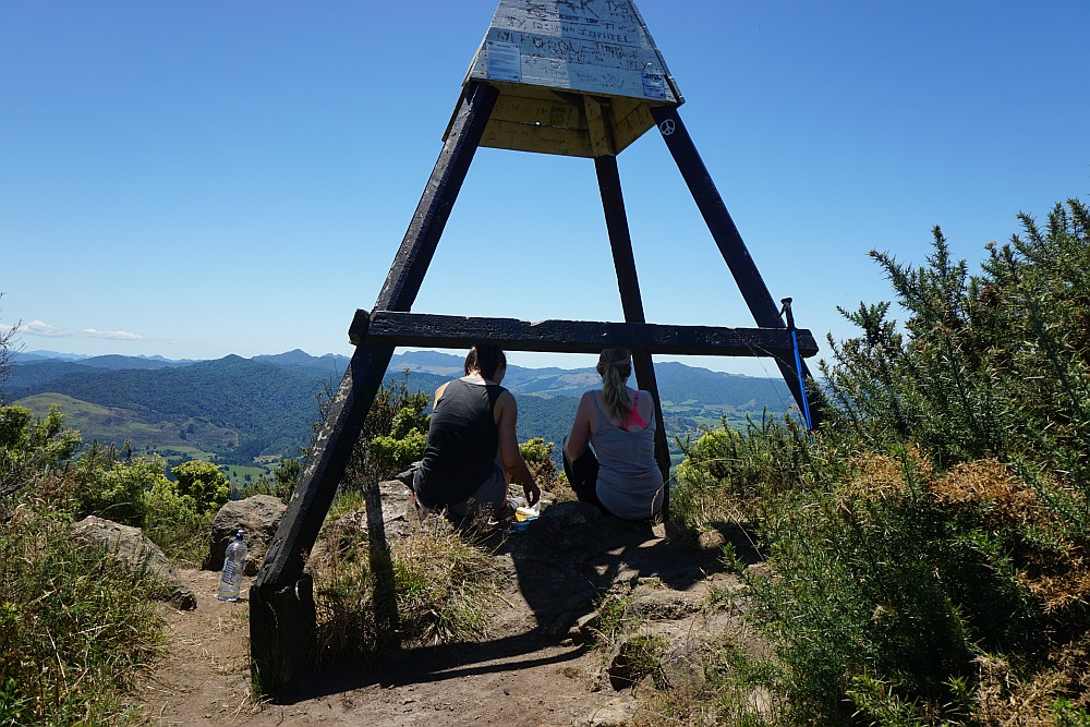 Two young women enjoying some shade and the view from the trig station after a climb up the Mountain Track in hot weather.
