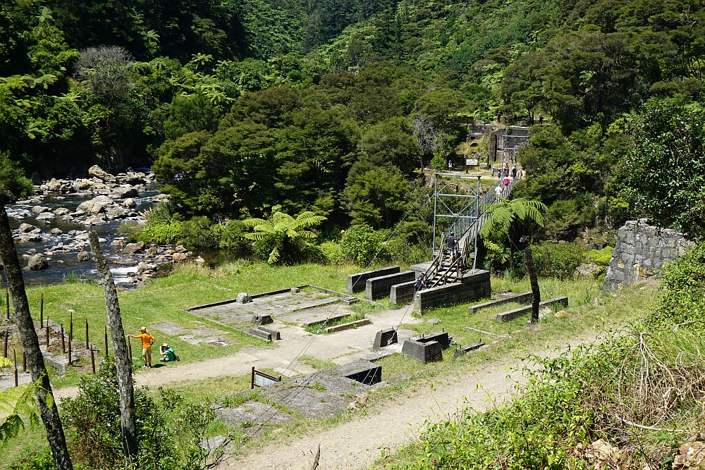 View from the end of Scotsman Gully track, with the suspension bridge across the Waitawheta River, where it runs into the Ohinemuri River, and remains of the old gold processing plants.