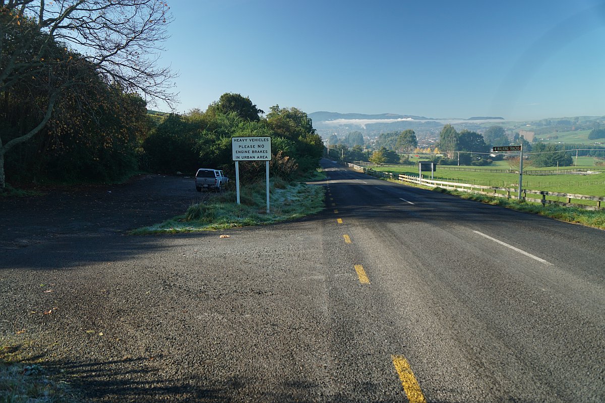 Looking down Paradise Valley Rd towards Rotorua and the steam from the Whakarewarewa thermal area, with the carpark on the left.