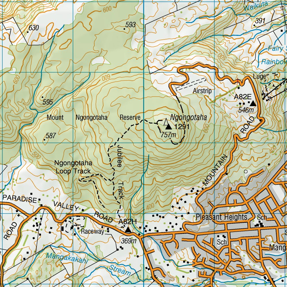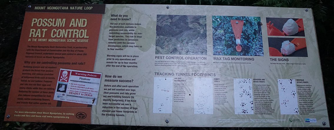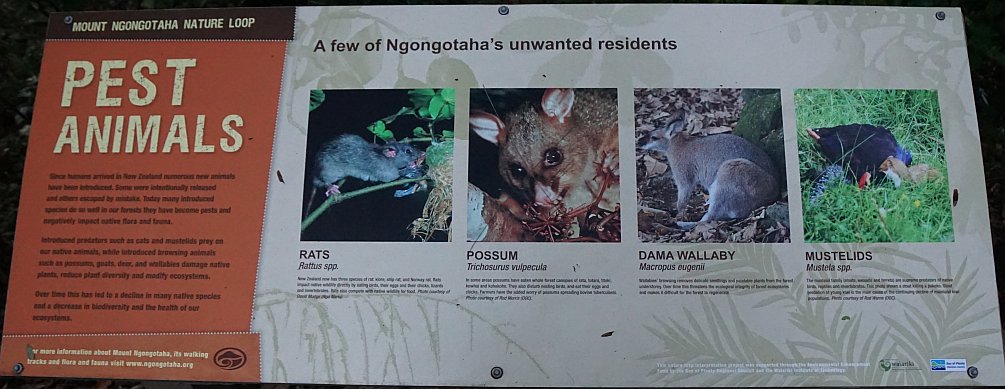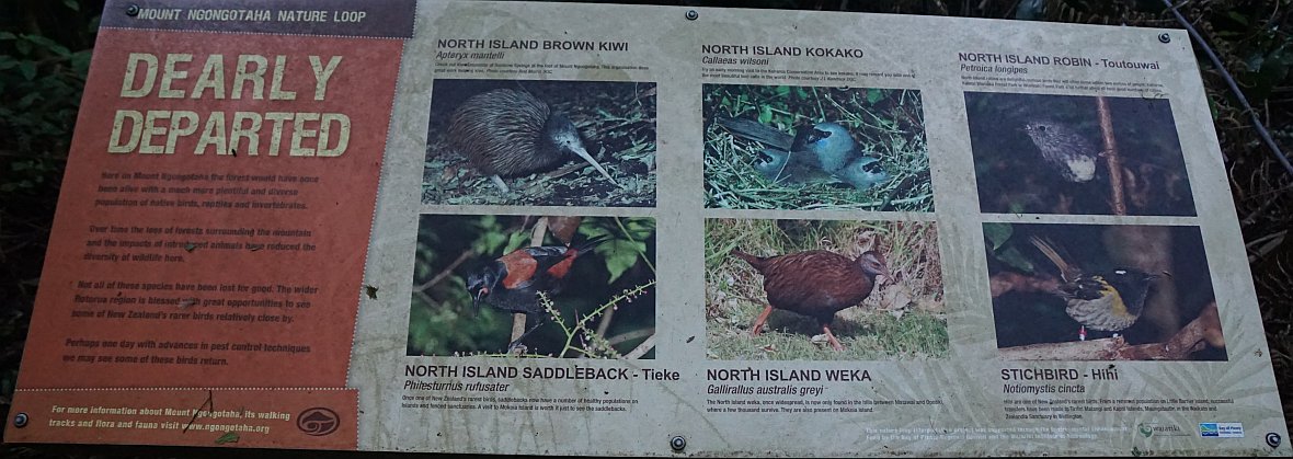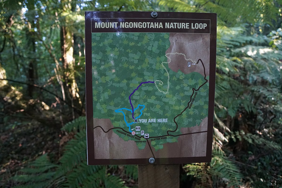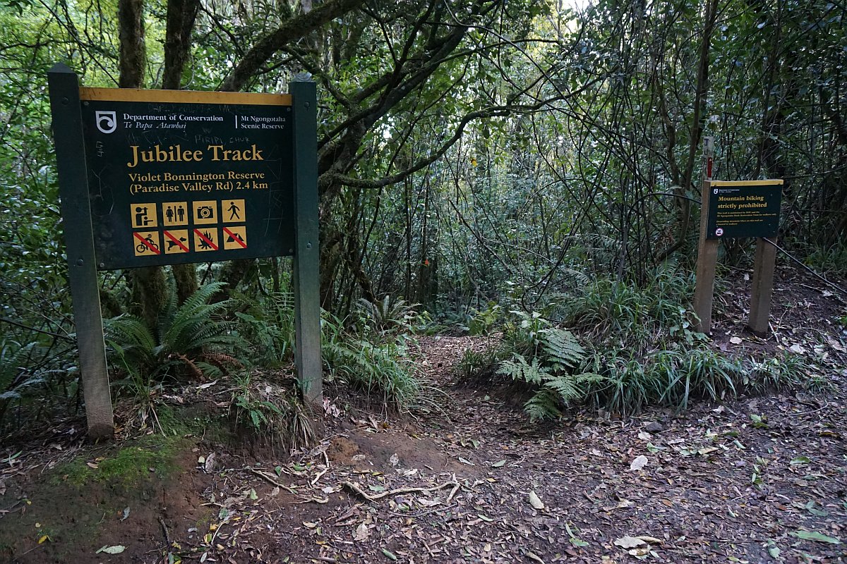 The 757 m high summit of Mt Ngongotaha, near Rotorua, is accessible by the Jubilee Track, a walking track starting by Paradise Valley Rd, or by walking or biking up the last 5 km or so of Mountain Rd from the carpark and locked gate. The lower part of Jubilee Track is shared with the Nature Loop, an easy 3.7 km long loop with numerous information signs and panels. Unfortunately there are no longer any views of the surrounding area from the summit, due to the regrowth of native bush in the Mt Ngongotaha Reserve.