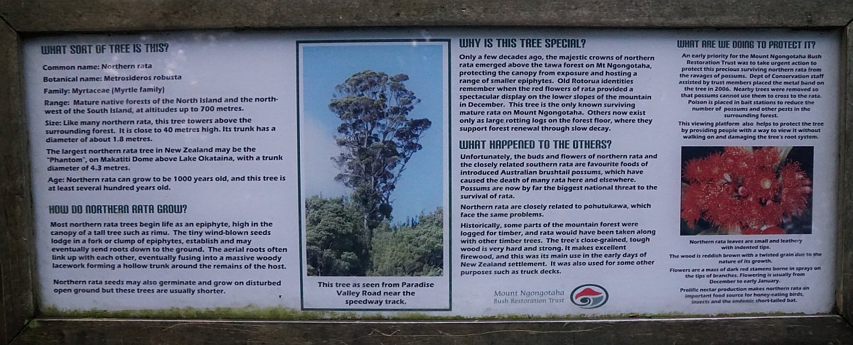 One of the largest surviving Northern Rata trees has a viewing platform by the Nature Loop track.