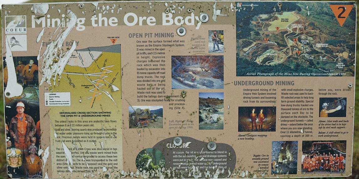 Gold was discovered at Golden Cross in 1892, and an underground mine operated there from 1895 to 1920, extracting over 2.5 tonnes of gold from about 160,000 tonnes of ore. The area reverted to farmland after the mine was closed, until the new Golden Cross Mine started operating in late 1991. The new mine operated as both an open-cast and an underground mine. The mine closed again in late 1997 – early 1998 after extracting 18 tonnes of gold and 52 tonnes of silver. Water from the mine site is still being treated, and the tailings dam is still present.