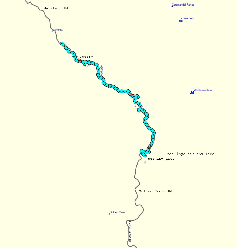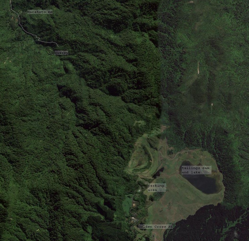 The satellite image of the area is taken from Google Maps. This also shows Maratoto Road extending as far as the disused quarry.