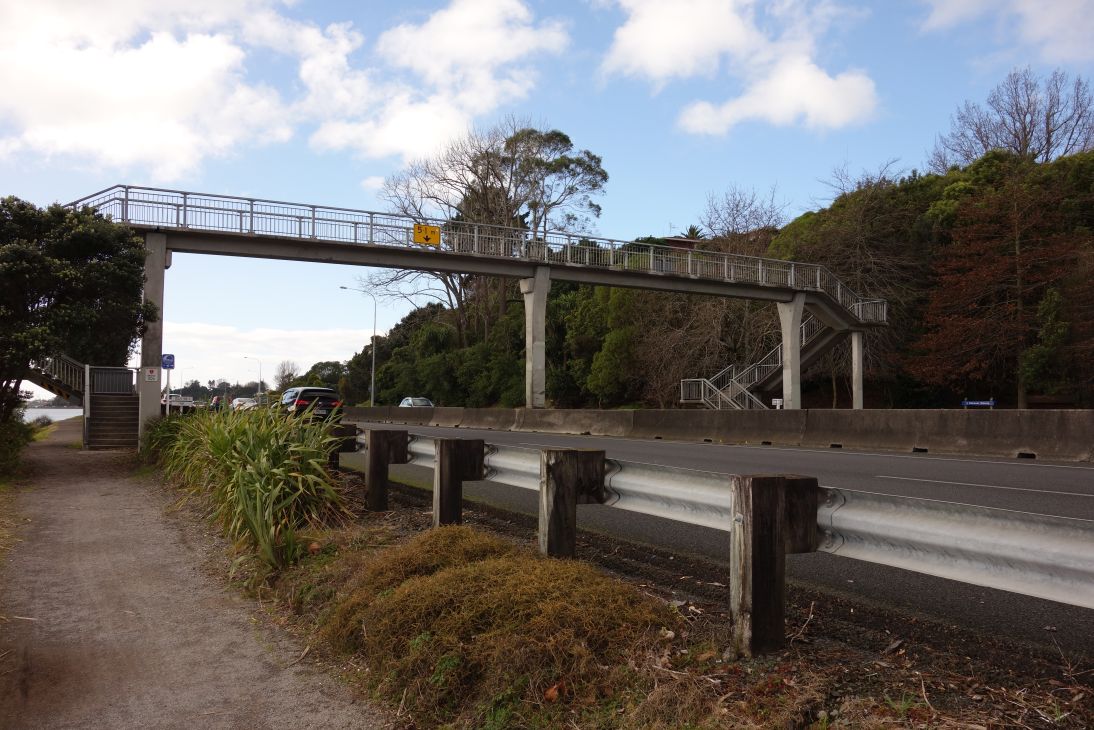 There are two pedestrian bridges crossing over Takitimu Drive. This one not far from Waihi Road.