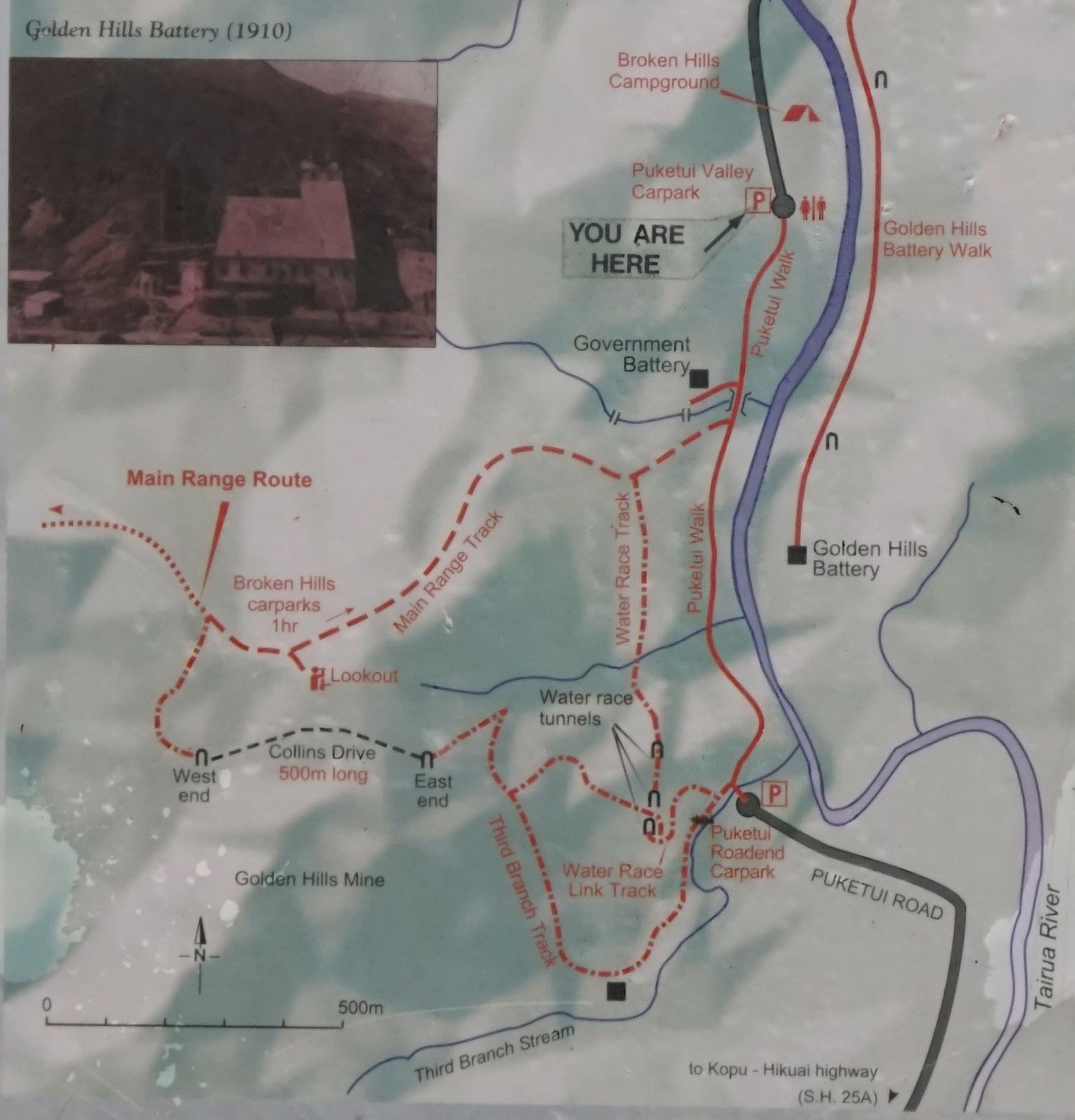 No attempt was made to cross the Third Branch Stream to Puketui Roadend Carpark. Total distance walked was about 7.2 km, with a total time of 3 hours 35 minutes, including a break of about 10 minutes at the West end of Collins Drive for lunch. A good torch is required to walk through Collins Drive, a 500 metre long tunnel.
