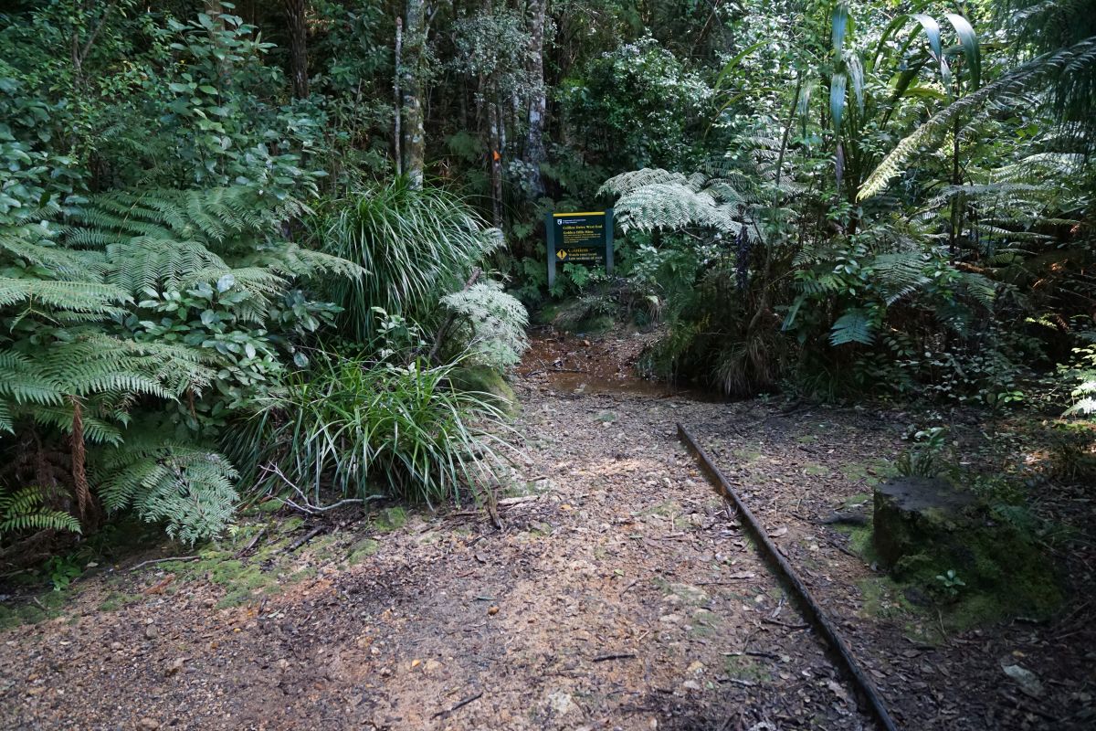 The track leading up the hill on the left is the track to East End of Collins Drive. There is another drive into the hillside at the start of this track. The short track ahead to the right leads to a sign marking an aerial ropeway. The track at picture bottom leads to Third Branch Track and Water Race Link Track.