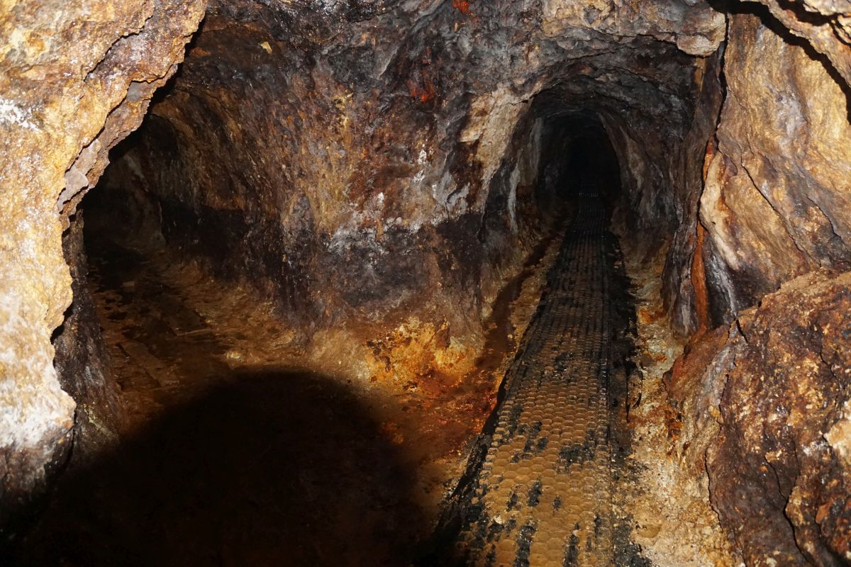 The West End entrance to Collins Drive. Note that a good torch is required, as the tunnel is about 500 metres long, narrow and with a low roof in places, and with a bend about halfway along so both ends are not visible at the same time. Water drips from the ceiling, so warm clothing is recommended. The sign advises the use of a hard hat. A rubber mat floor is provided through the main drive.