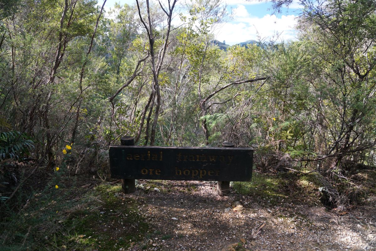 The sign indicating aerial tramway ore hopper. No hopper is visible, but an unmarked track with steps leads downhill on the far right. This track is not marked on the maps, and no attempt was made to follow it down the hill.
