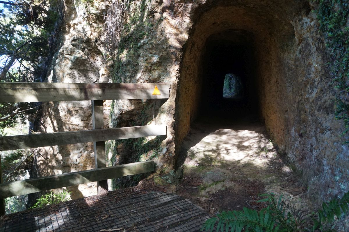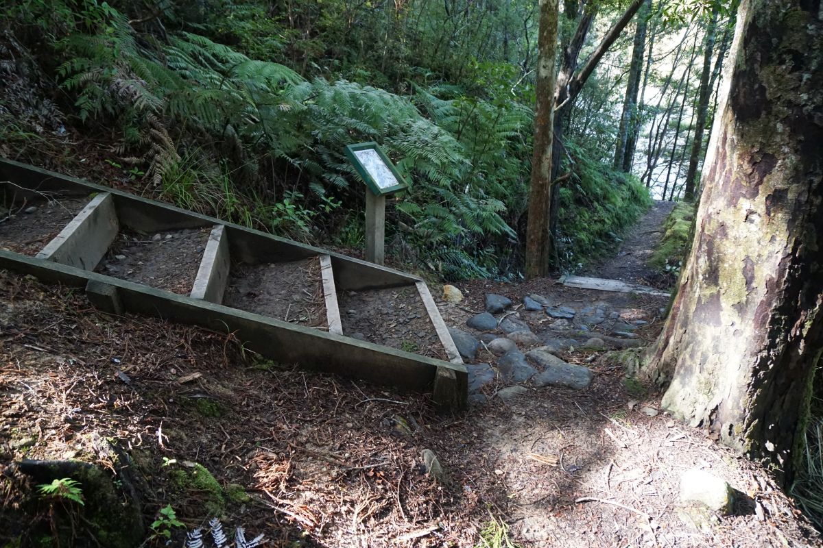 The Water Race Track runs between Main Range Track and Water Race Link Track. There are 3 short tunnels on the track, none of which requires a torch, and some steeper sections with steps. The track continues where the handrails are visible across the valley by the rocky outcrop.