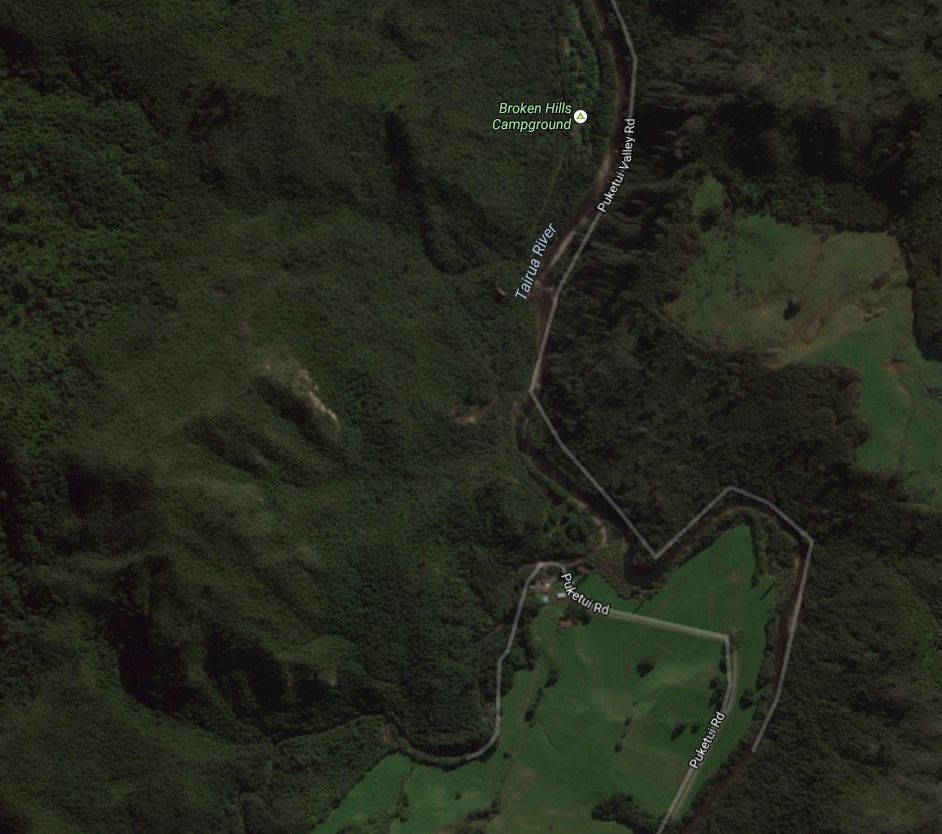 Google maps shows an incorrect location for the last part of Puketui Valley Road. The road crosses the Tairua River about 500m north of the campground, and continues on the western side of the river, ending a few metres past the campground.