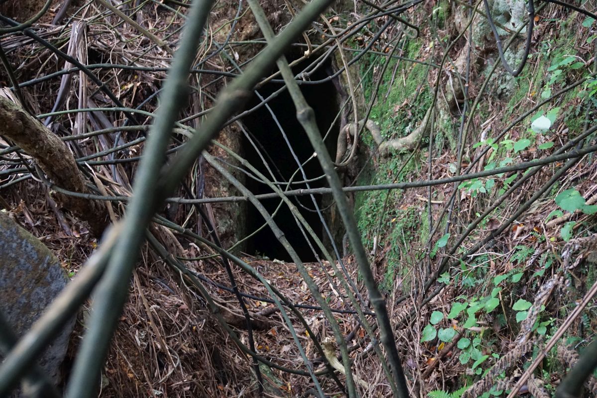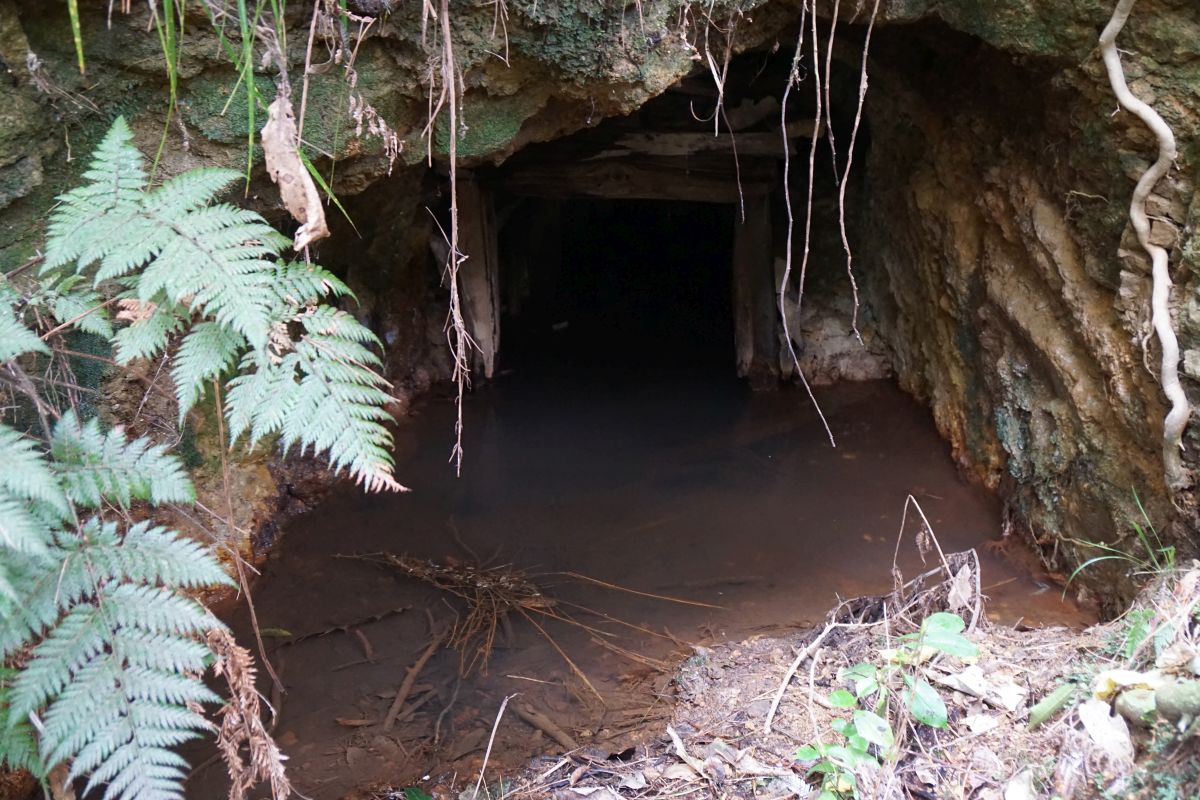There are a few signs of mining activity along the track, including a short section of water race, with the race continuing in a tunnel through a ridge. This is the exit from the tunnel.