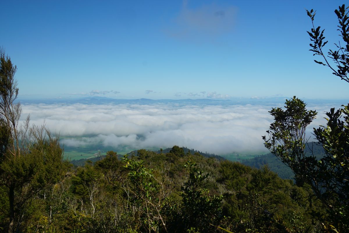 View to the north-west from near the junction with Kaimai Ridgeline Track, with the summit of Mt Te Aroha to the right.