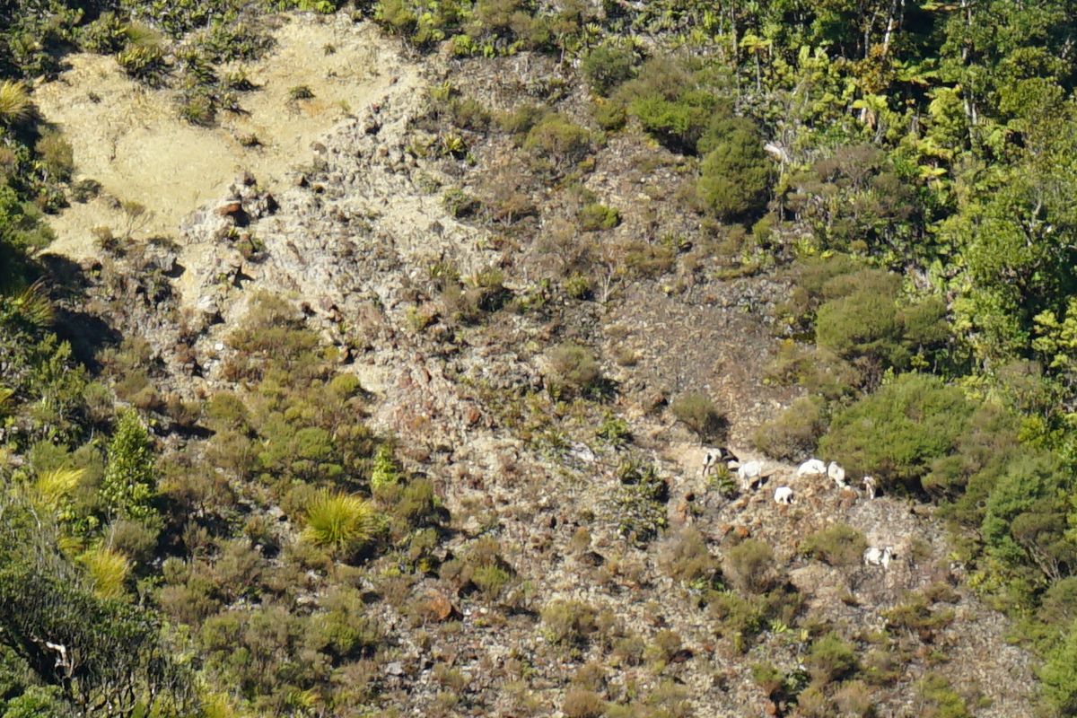 Goats were grazing and resting in the sunshine by the slip below Pahiko peak.