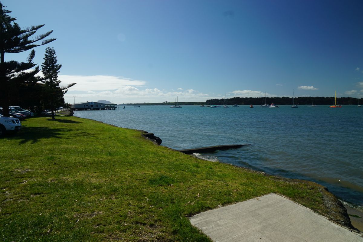 The waterfront alongside The Esplanade, looking towards the Omokoroa Boat Club building and Mauao/Mt Maunganui behind it. Parking is available along The Esplanade.