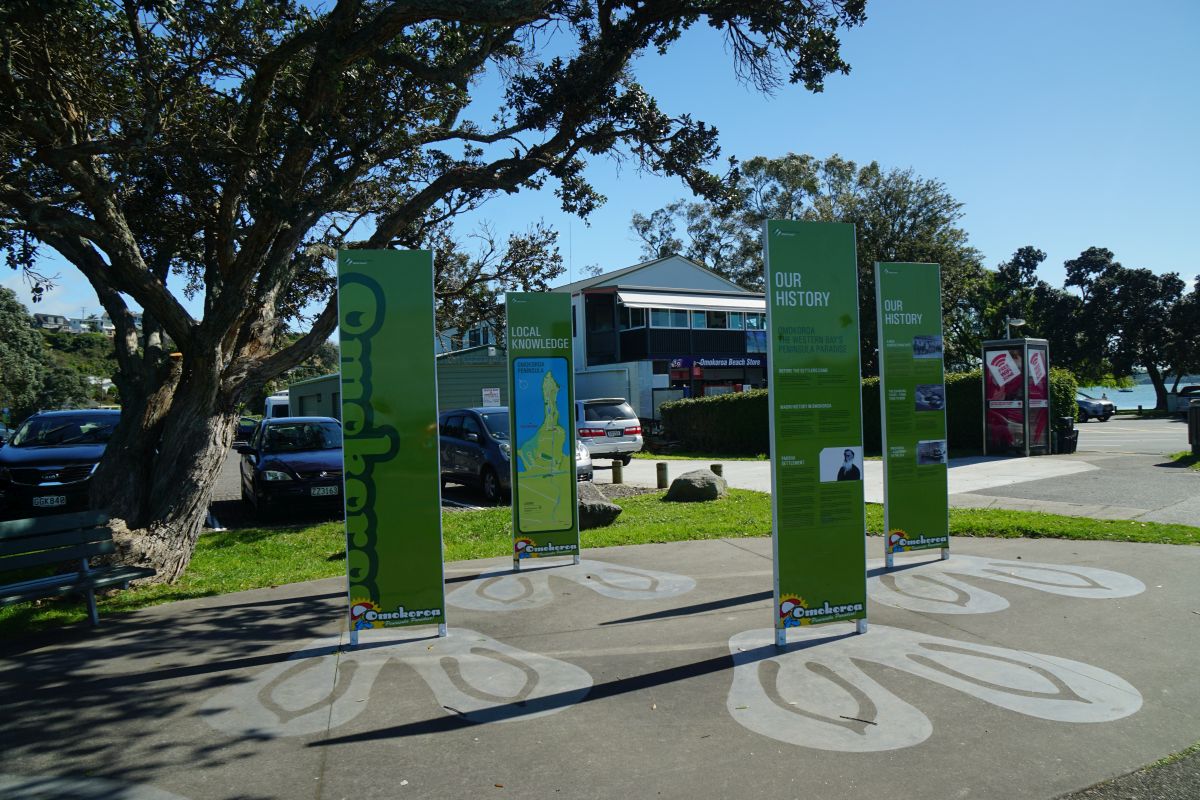 Information signs are located by the parking area and shop at the northern end of The Esplanade, near the jetty used by the ferry service to Matakana Island.