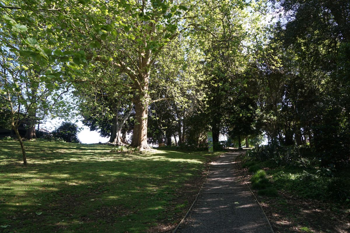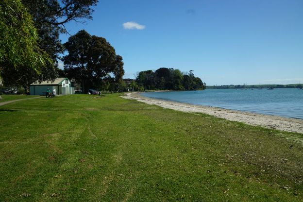 Looking along the Domain, with the tree-covered Gerald Crapp Historic Reserve at picture centre. Toilets are on the left. Parking is available along the waterfront behind the toilets.
