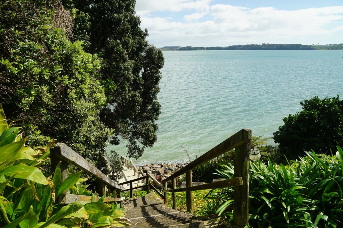 The walkway continues along the western side of the peninsula, with a steep bank down to the Tauranga Harbour on the right, and residential homes on the left.