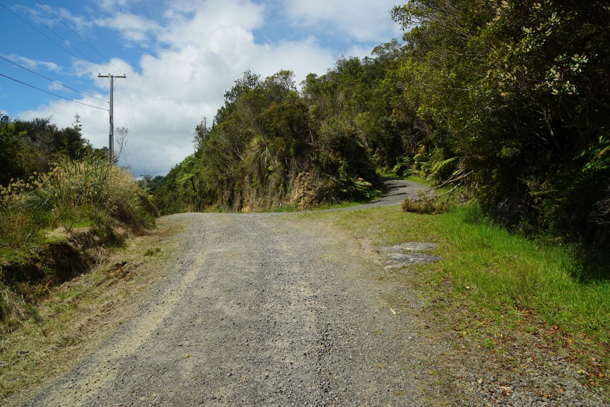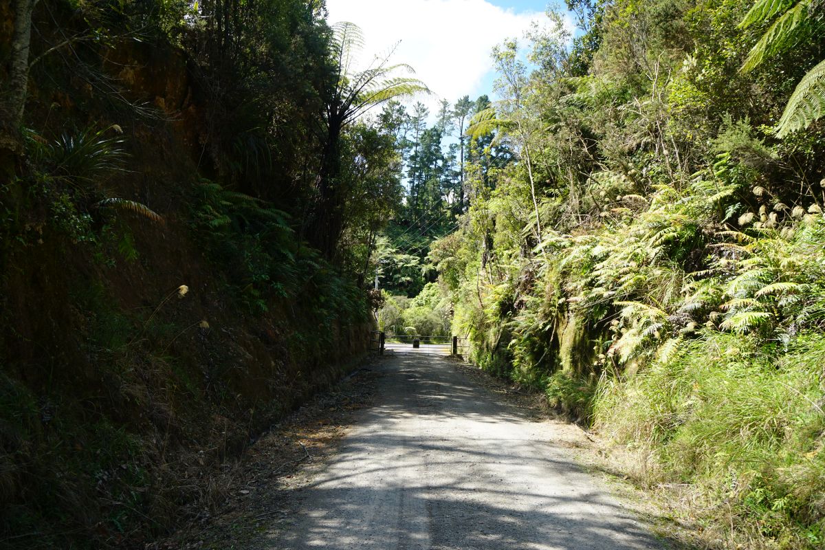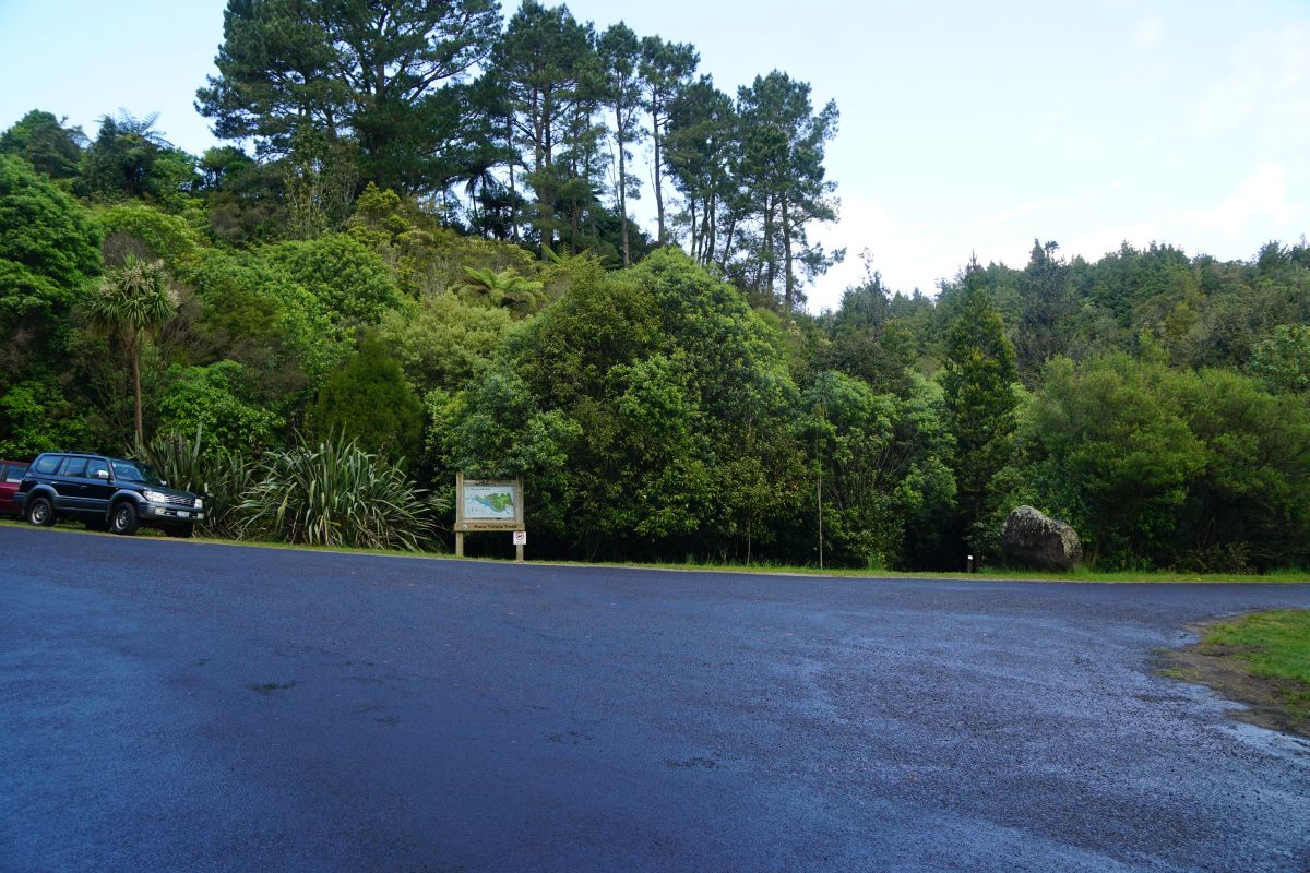 The junction with the small parking area. The road to the right leads to Lake Mangapapa, the one to the left leads to the park rear entrance/exit which is normally closed, and the one on picture bottom leads back to the main entrance. The start of the Rimu Track is by the large rock to the right of centre. There are several small kauri trees by the track start.