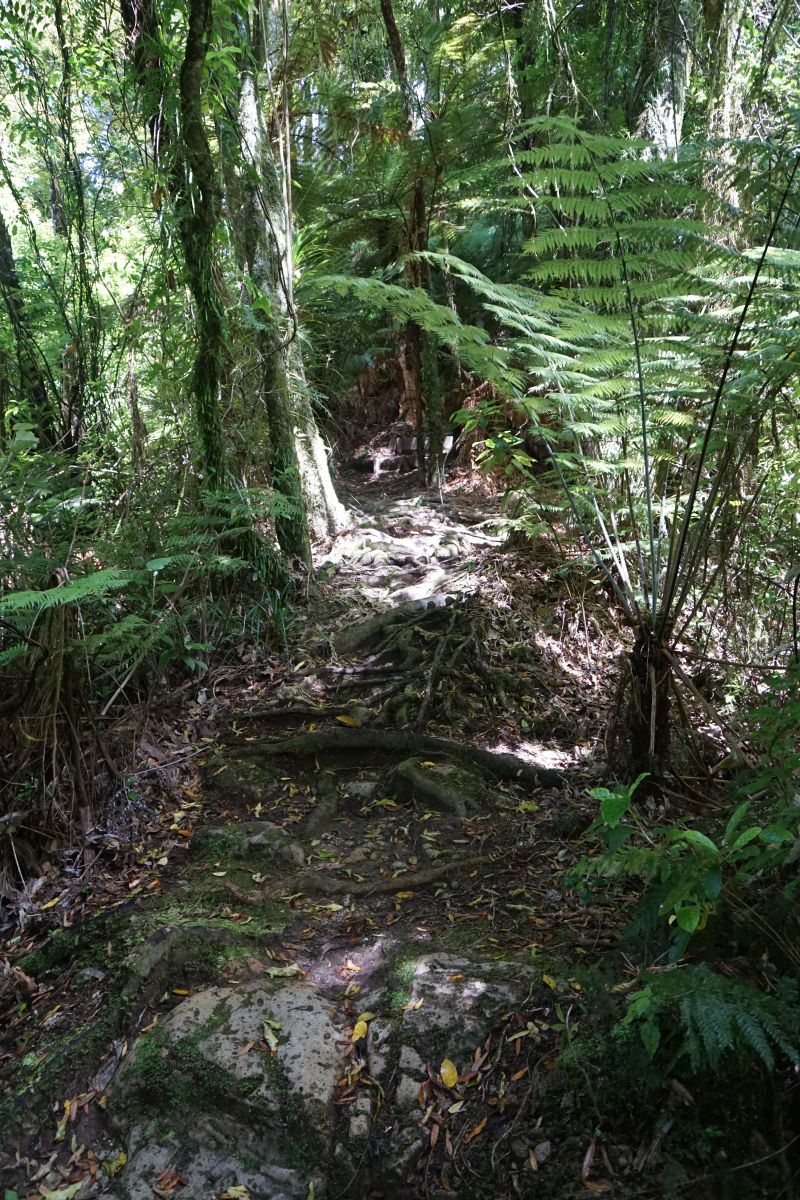 The Rimu Track is short, but quite steep in places, and with numerous steps. It climbs from the road junction through a valley to a plateau with an easy loop track, and a side track down past 3 large rimu trees (The 3 Sisters) to the road leading to Lake Mangapapa. The road can then be followed back to the junction, or a side road and track can be taken back up to the Rimu Track.