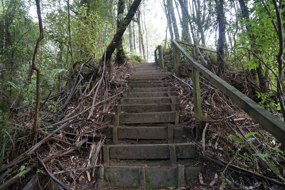 A longer set of steps leads up a steeper section to a small clearing, and one corner of the loop track on a plateau.