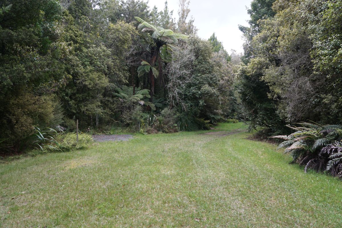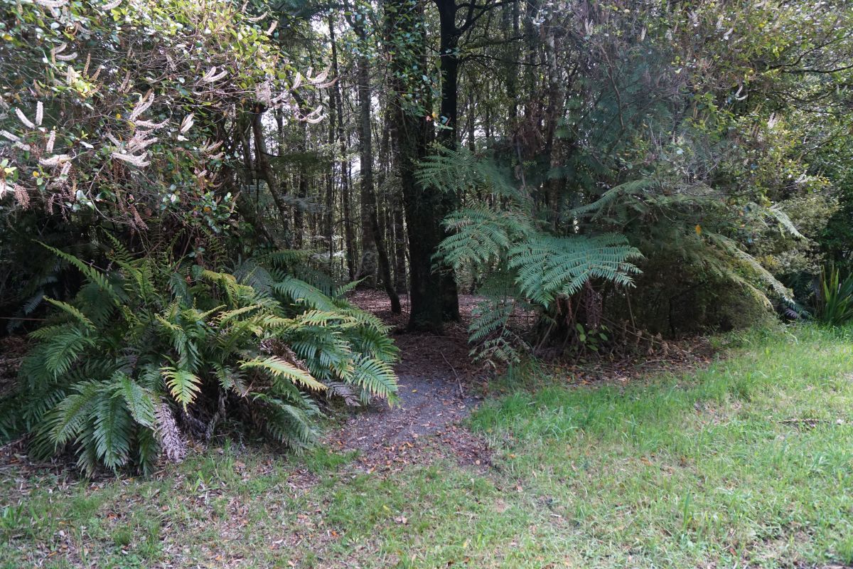 There are active beehives on one side of the grassed area, on the far left. The grass track at the upper right leads directly to the small clearing and the one to the bottom right leads to the start of the track down to the 3 rimu trees. Both of these grass tracks are part of the loop track.