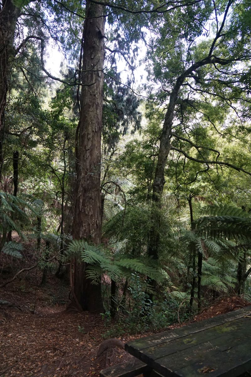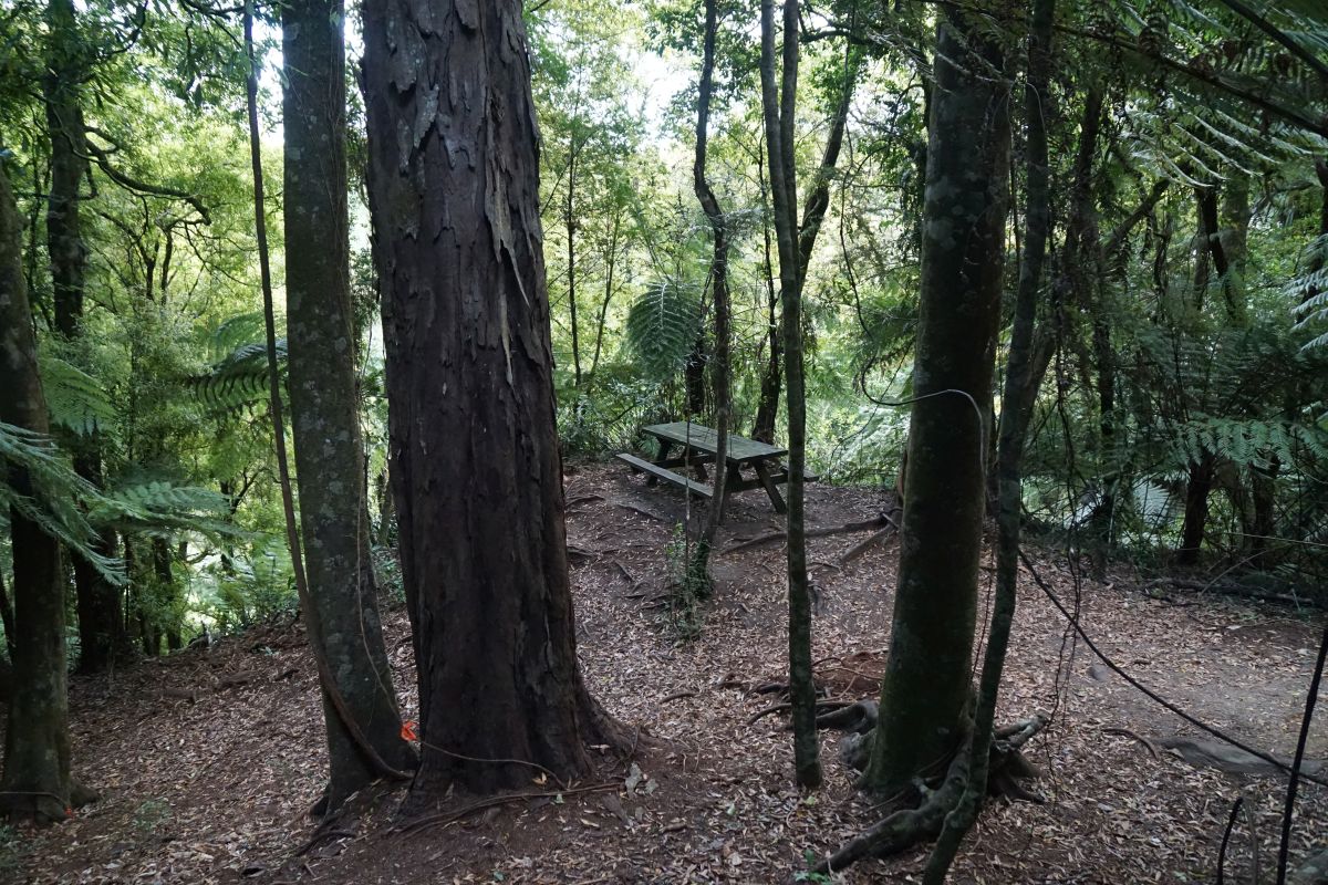 The track leads downhill through trees to a picnic table and the 3 large rimu trees. The first of these is in the foreground, to the left of the table.