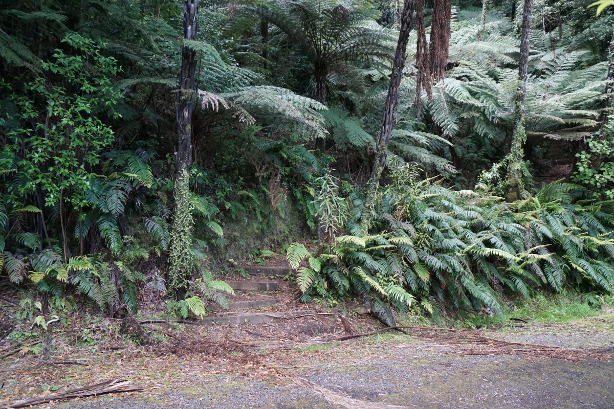 The track to the right from the picnic table leads down to the road to Lake Mangapapa, and the road back to the junction and parking area. The steps are the start of the track up the hill to the 3 rimu trees and to the loop track.