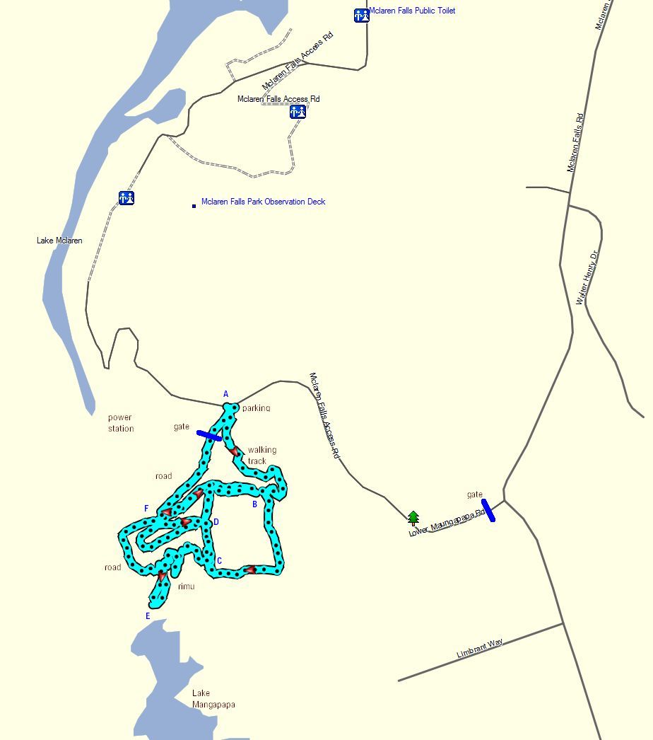 The GPS tracklog shows the tracks walked. Starting at A, to the small clearing at B, past C to D while looking for the side track to the rimu trees, the loop to the left of D, back to C, down the hill past the rimu trees to Lake Mangapapa at E, to the junction at F, up to B and back down to F, and then by the road back to A. Total distance 2.9 kms in just under 1 hour. The part times and distances were:
