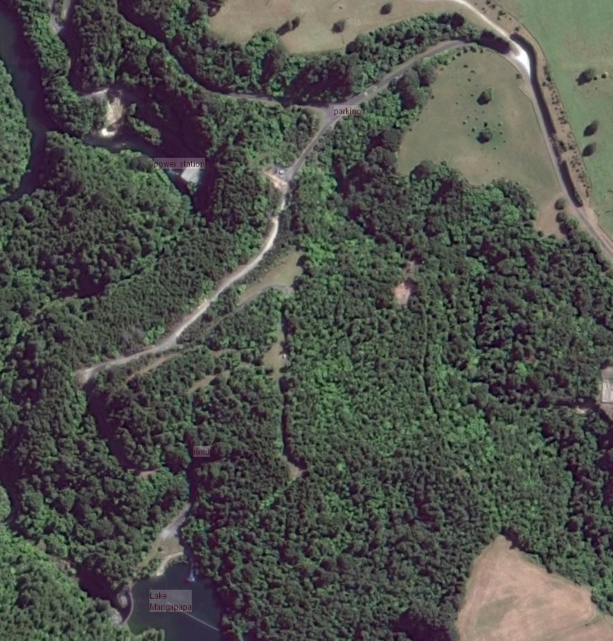 The small substation above the Lower Mangapapa hydro-electric power station fed by water from Lake Mangapapa. The small parking area by the start of the rimu track can be seen on the far right.