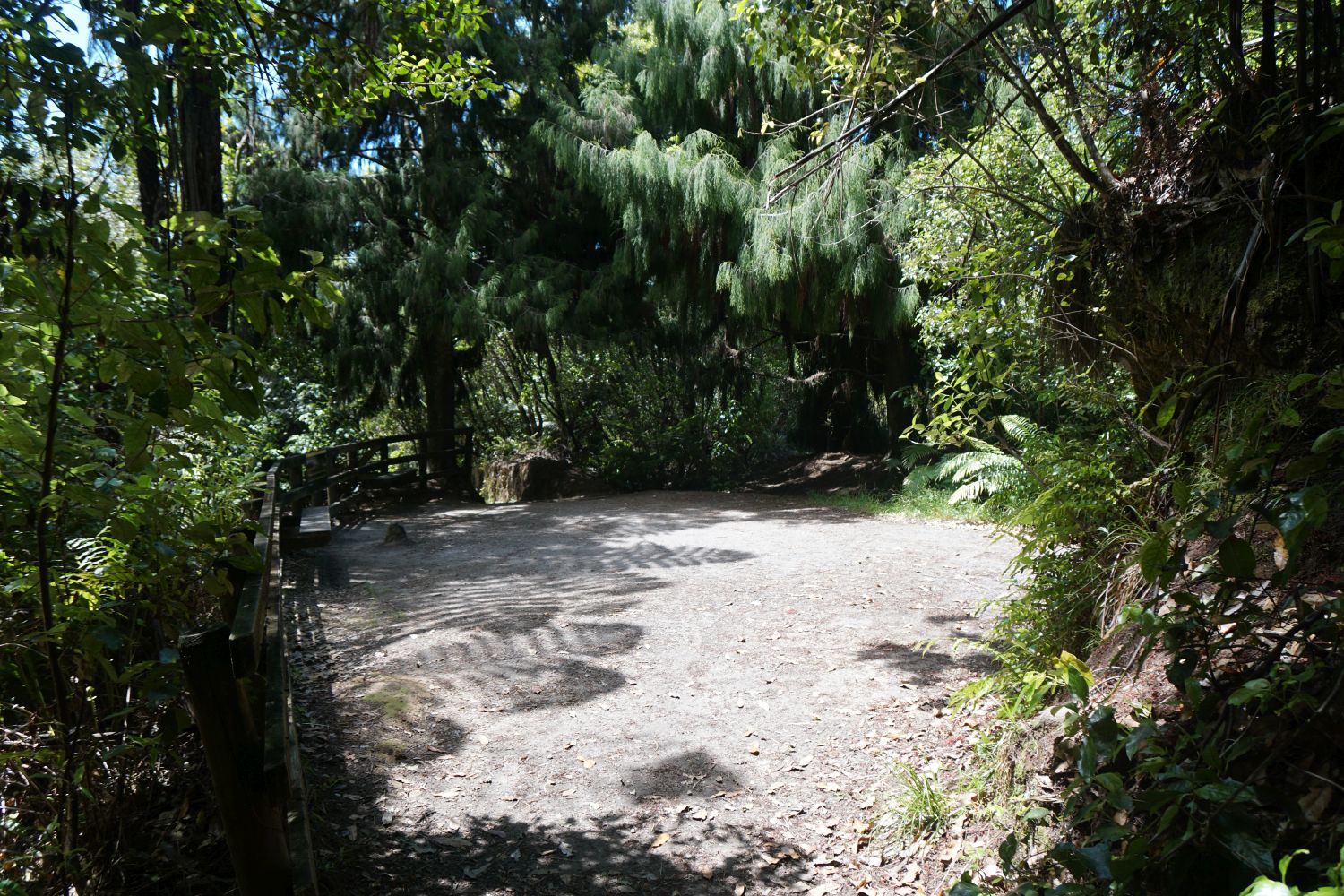 The parking area by Trout Pool Road, at the southern end of the walking track through the Okere Falls Scenic Reserve. with the track starting at the upper right. There are steps leading down to the river behind the bushes at lower right.