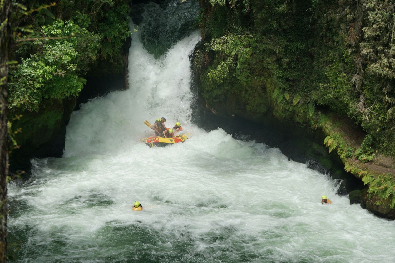 The Tutea Falls are narrow, and the rafts pick up enough speed to be completely submerged at the base of the falls. Several of the rafters often end up overboard.