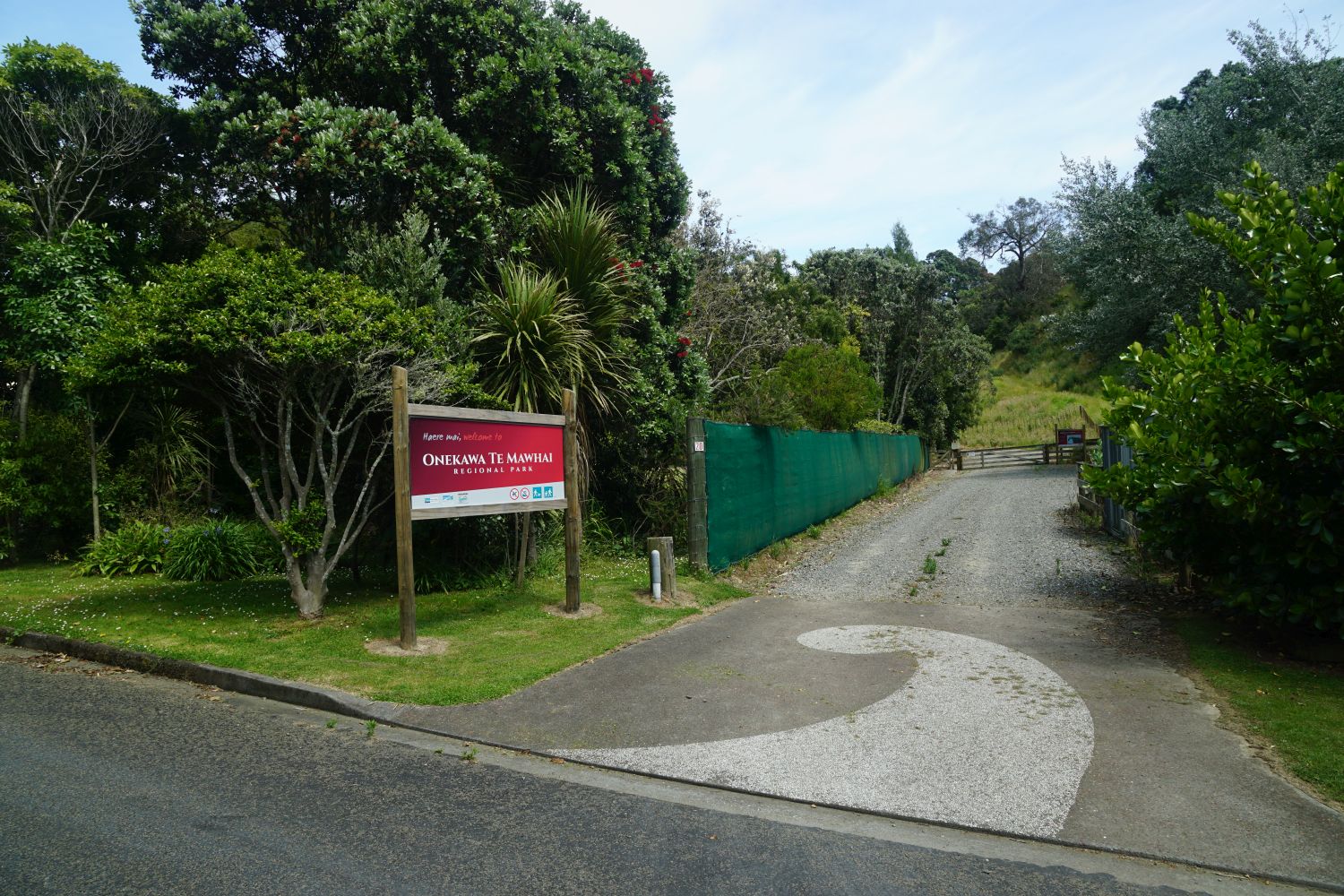The official entry point to Onekawa Te Mawhai Regional Park from Ohiwa Harbour Road. This entry is about 300 metres south along Ohiwa Harbour Road from the entrance to the Holiday Park.