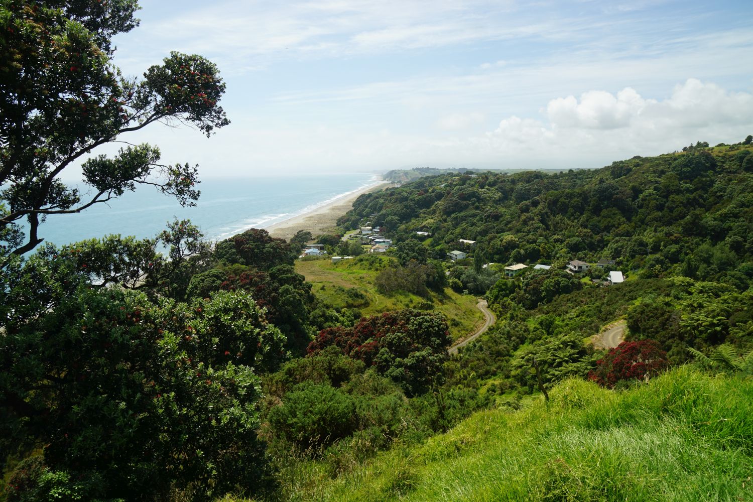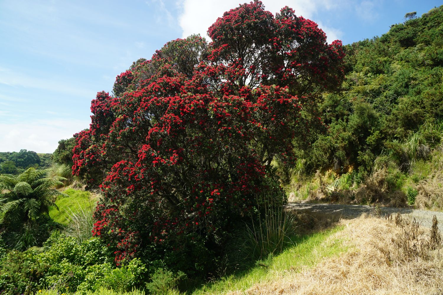 Some of the pohutukawa were still in bloom. This one next to the vehicle track.