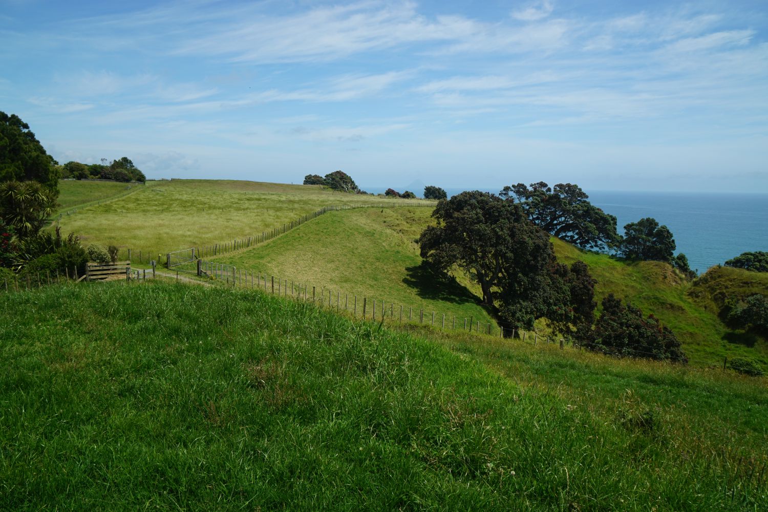 The farm vehicle track continues to the left, and the direct walking track to the pa sites is through the steel gate on the right. Either route can be taken to reach the pa sites, with the vehicle track being a gentler gradient. On this walk the vehicle track was taken on the uphill walk, and the direct track on the return walk.