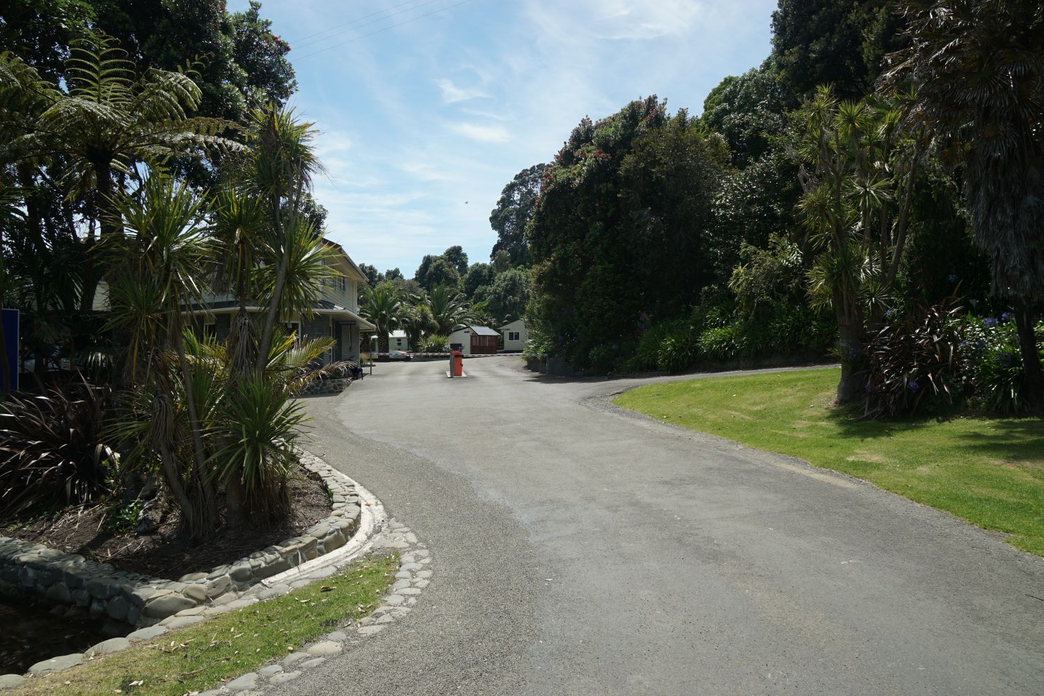 The track ends within the Ohiwa Beach Holiday Park, on the far side and to the right of the vehicle barrier arms, by the buildings at the centre of the picture.
