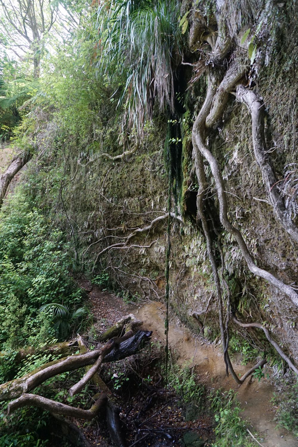 The cliff face where glowworms would be visible at night. Water is slowly dripping down the hanging root, with pohutukawa roots clearly visible on the right. There is an information panel about glowworms nearby. The track has reflective markers on some of the trees so it is easier to follow at night.