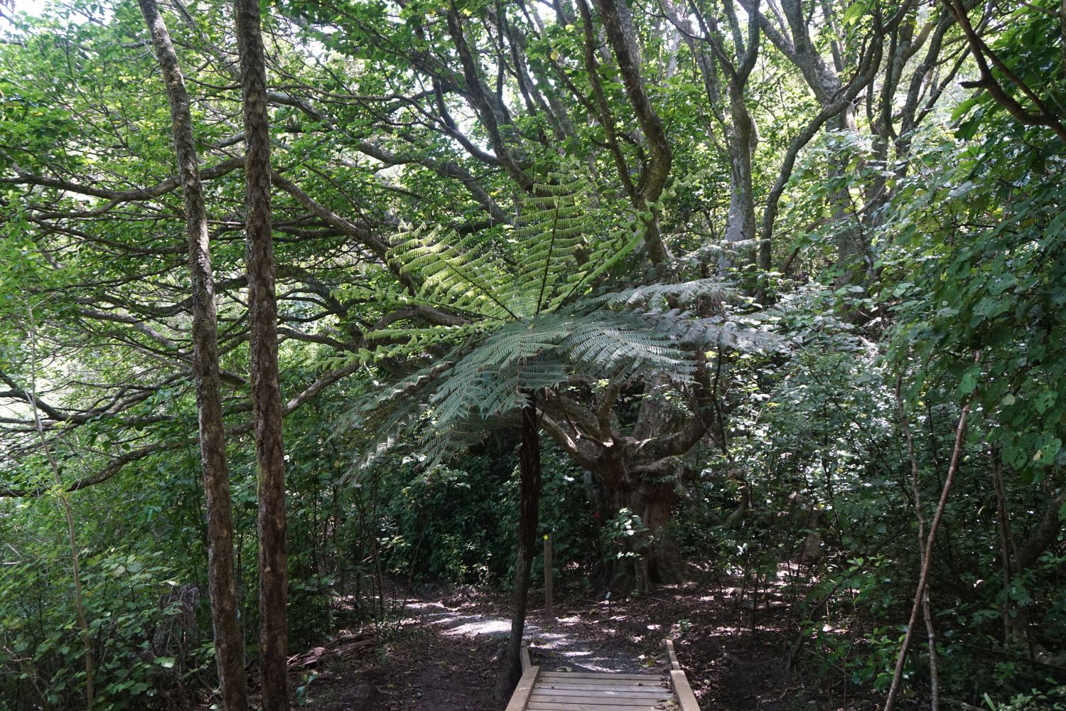 Heading towards Ohiwa from Onekawa pa site the path goes through a wooden gate into regenerating native bush. Many of the plants are marked with small information panels.