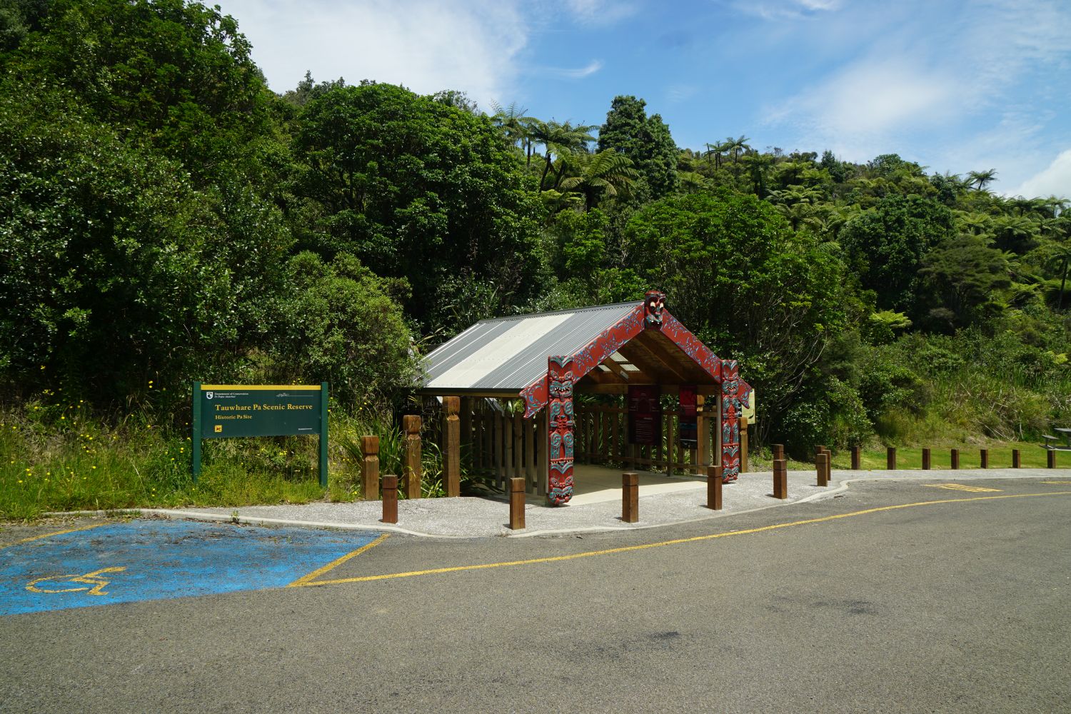 There is a parking area off Wainui Rd with information panels and a carved waharoa, or entrance, to the site.