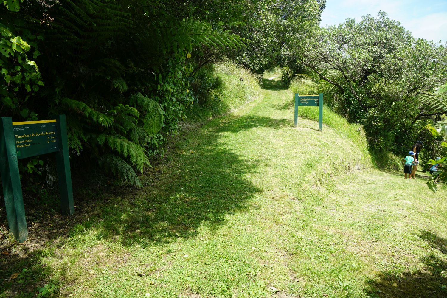 The waharoa or entrance to the reserve, with a short, easy track to the pa sites.