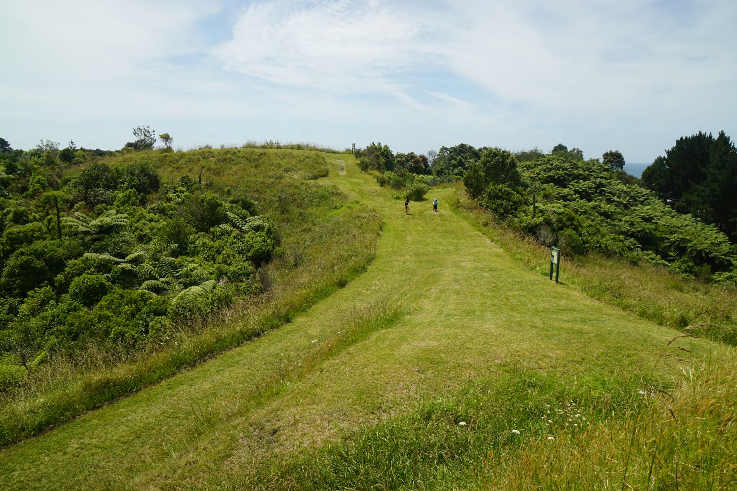The grass track is on a gentle slope up the side of the hill. On the signs the total time from the carpark (down to the right) to the first pa site (up at picture centre) is expected to be 4 minutes. An alternative track to Wainui Road is at the bottom of the picture.