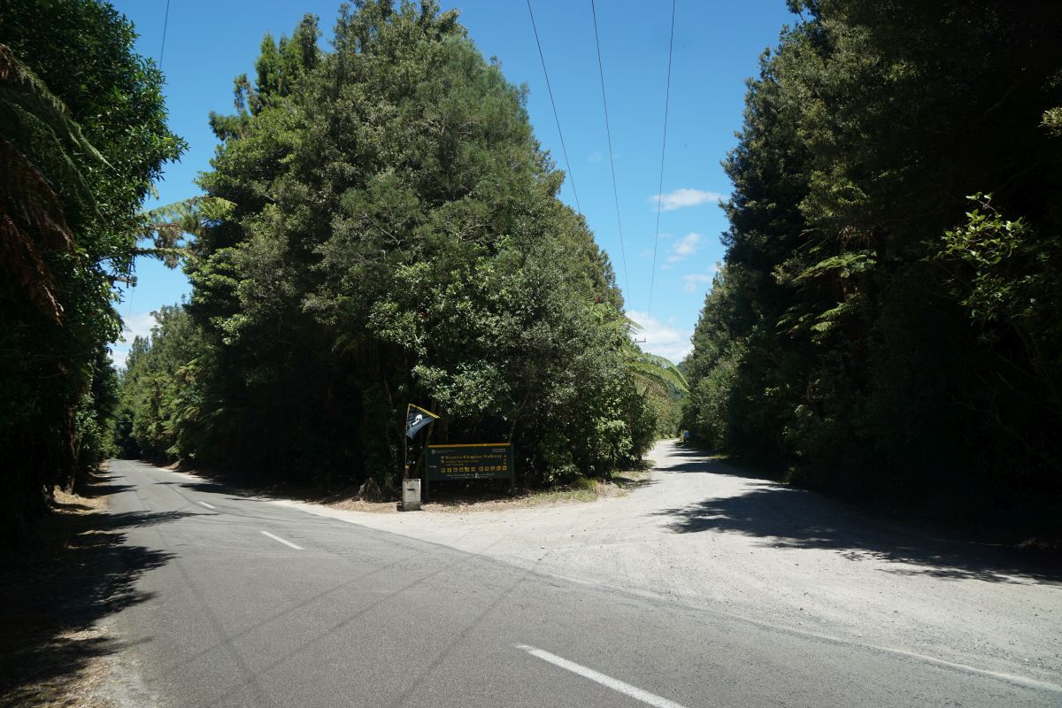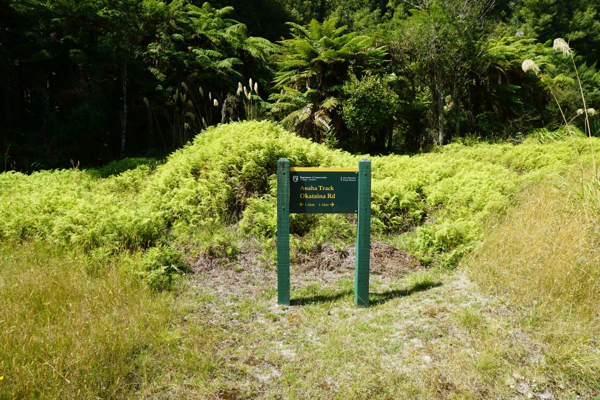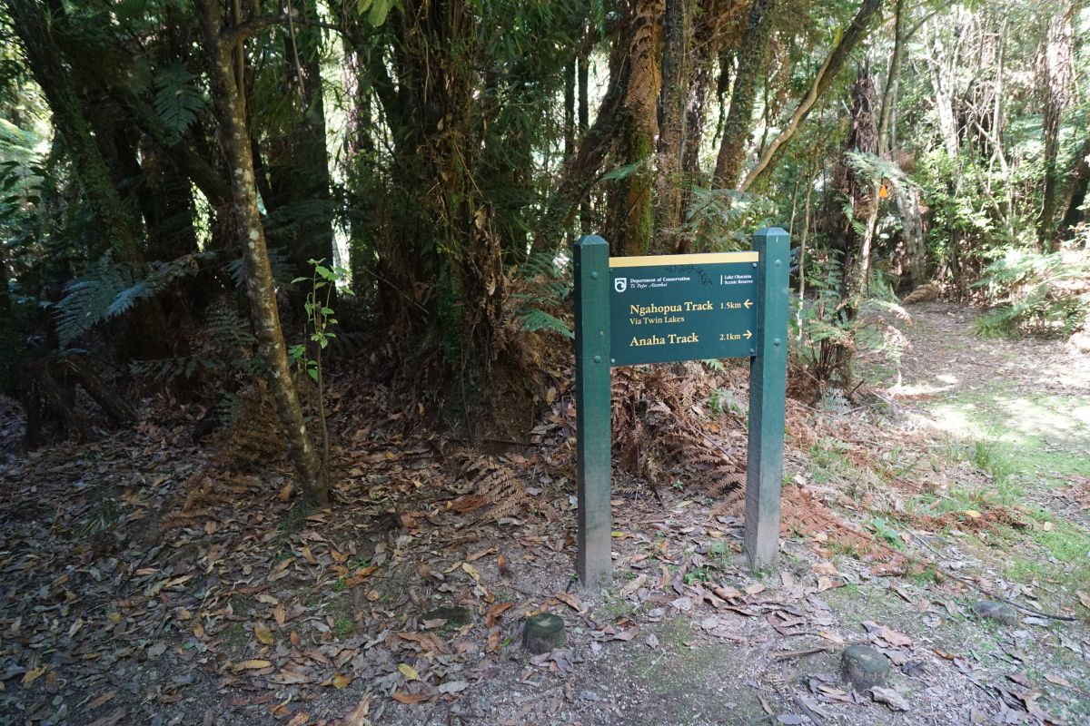 Ngahopua Track, on the left, connects to Anaha Track, on the right. A short, joint track of about 250 metres leads directly back to Lake Okataina Road, about 100 metres south of the road to the Outdoor Education Centre.