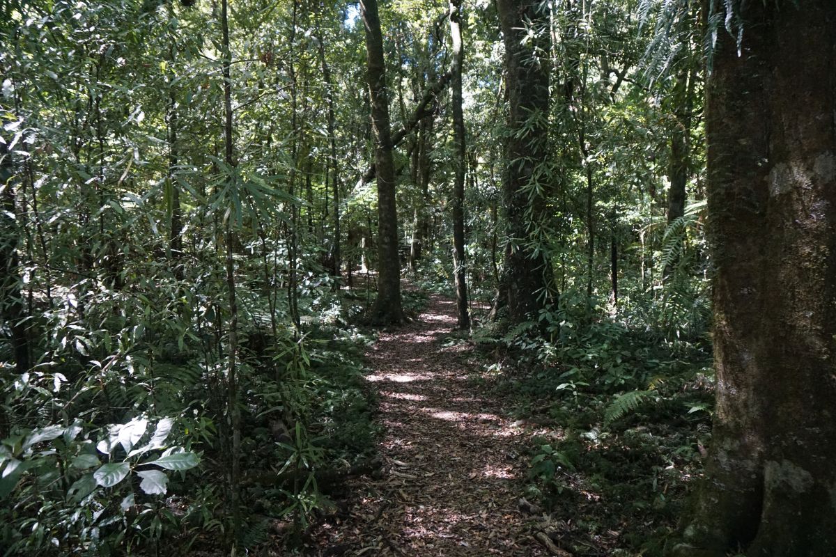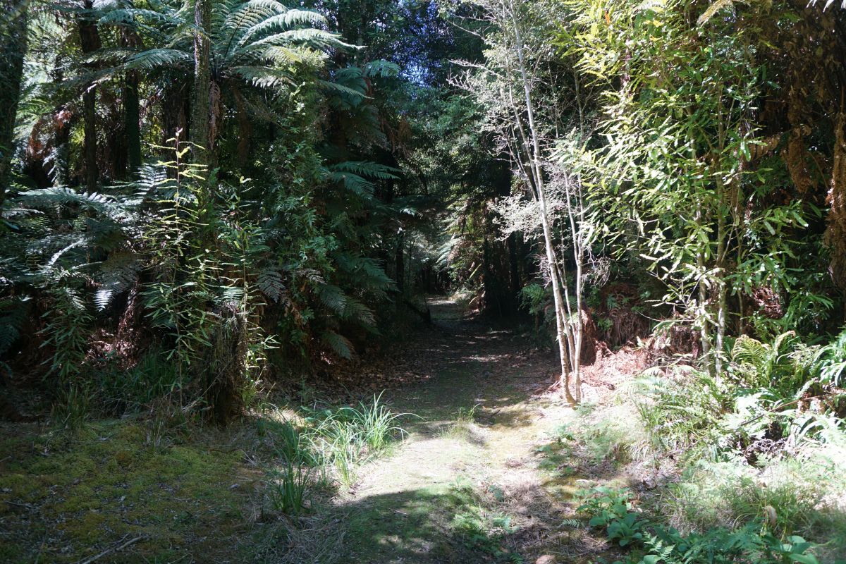 The narrow track passes through regenerating native forest, as well as past some mature trees. There are some gentle climbs and descents along the way.