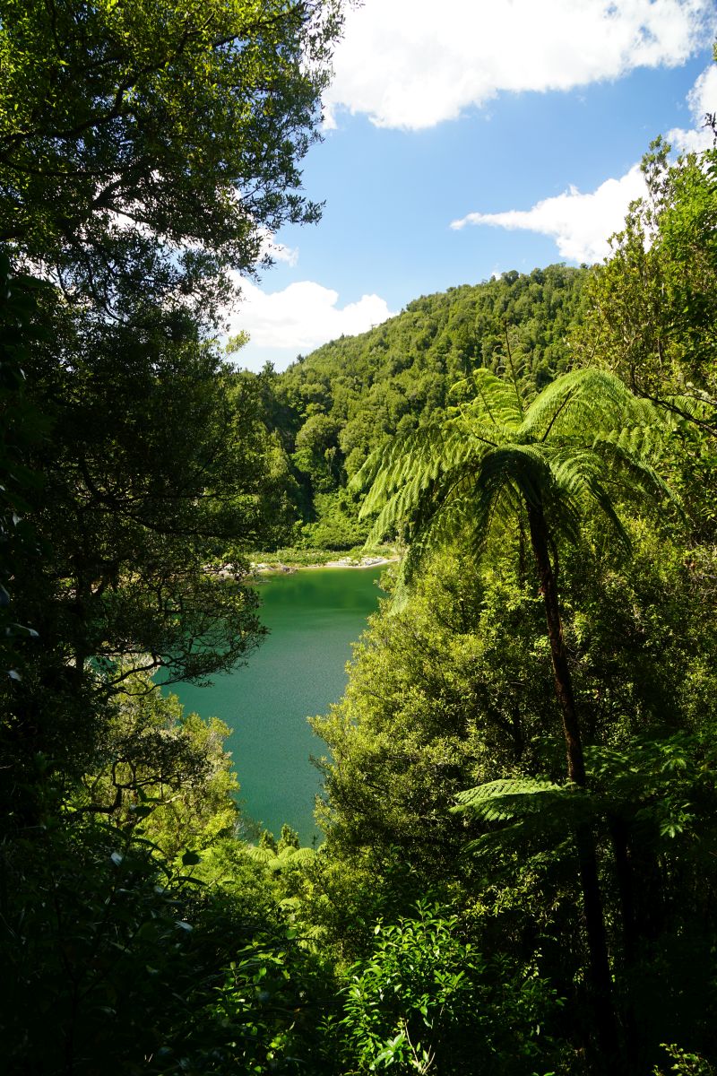 A short distance further on, Lake Rotoatua is only partly visible, with vegetation encroaching on the views.