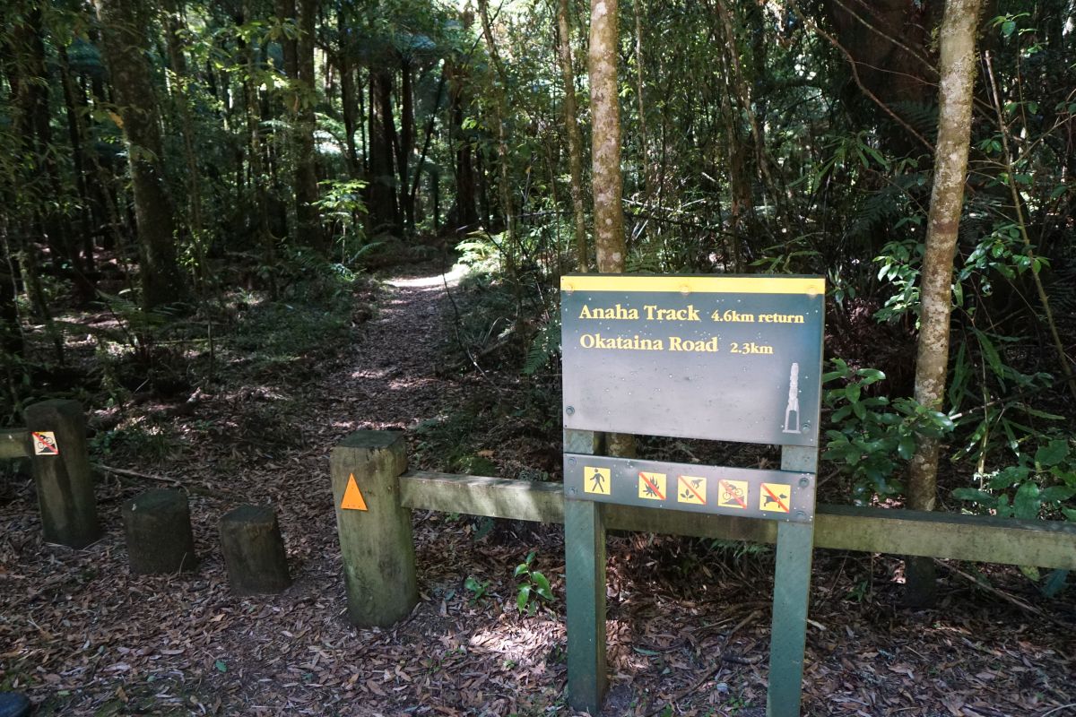 Anaha Track is wide and on mostly level ground. It passes through an area which was previously logged, so consists mostly of regenerating native forest.