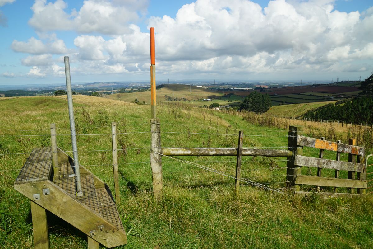 The walkway through farmland is indicated with orange pipe on the top of post, mainly steel y-posts, but in this case a wooden batten. Here looking back towards Puketutu Rd, with Pukekohe Hill visible between the marker and the stile handhold.