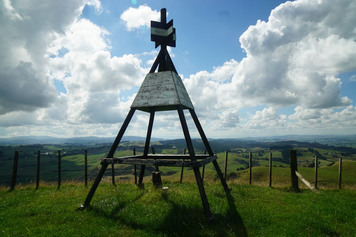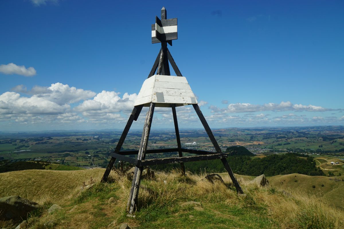 Mount William trig station, with views of the Waikato. Pokeno can be seen between the legs of the trig station, and just to the right of it.