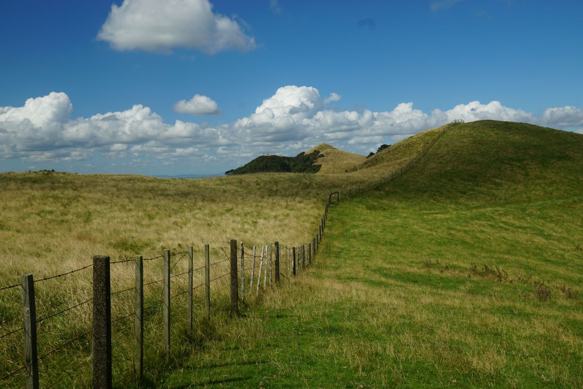 View towards the Kaimai Range from the trig station. The track continuing on to McMillan Rd follows the fenceline.