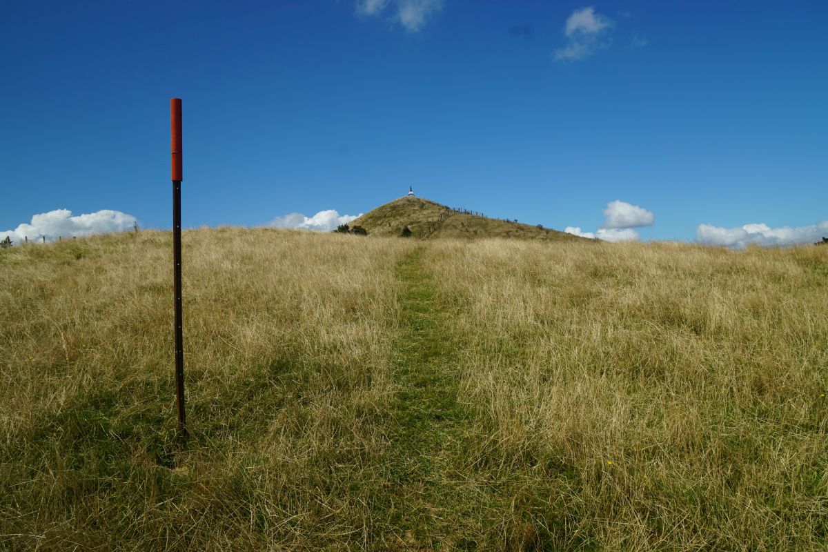 One of the steel y-post track markers where the walkway does not follow the fenceline. The trig station is clearly visible on the peak.